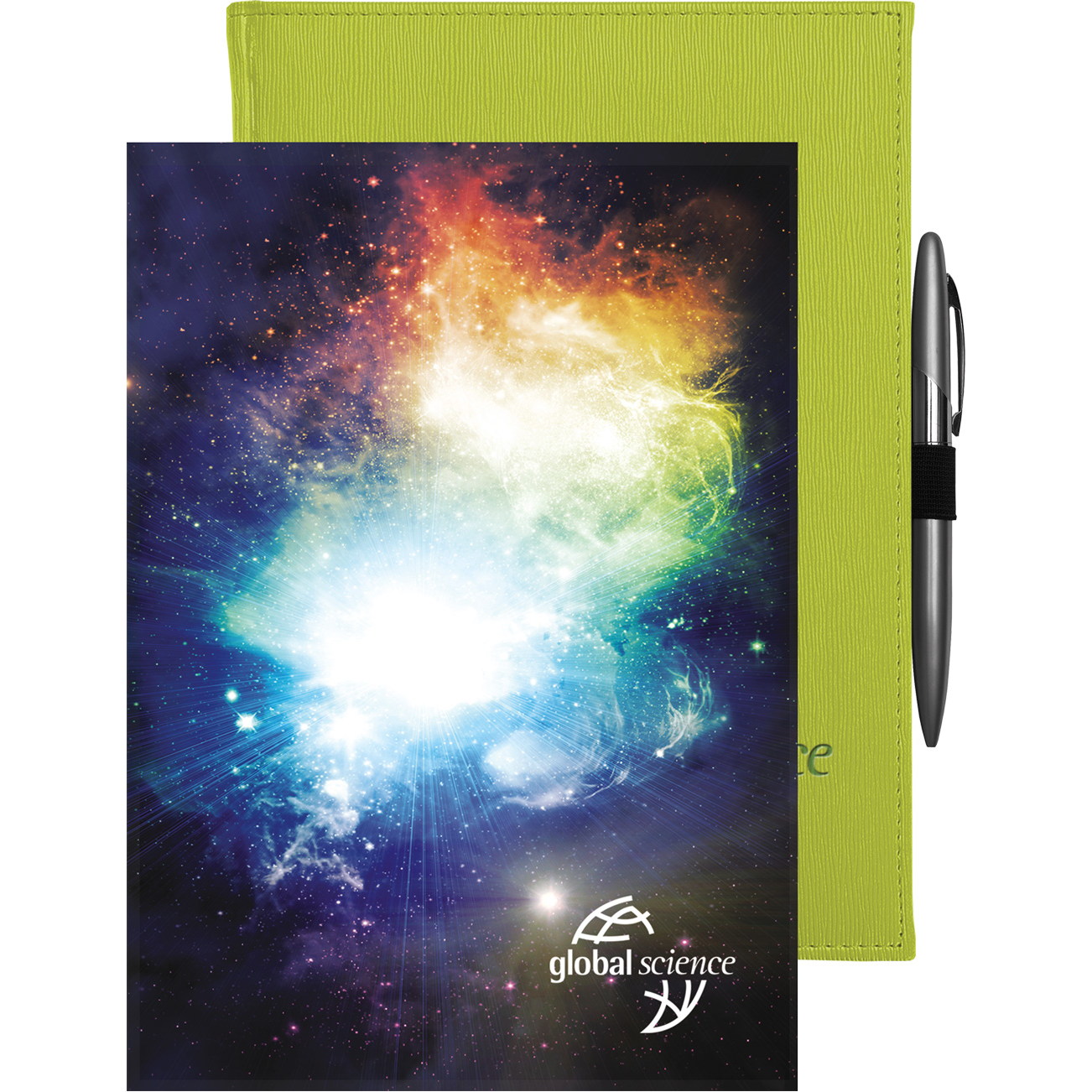 Vibrant, textured, padded covers in Pink, Orange, Lime, or Purple. Includes a blind deboss imprint and (1) custom full-color, 1-sided tip-in at front. Features quality, thread-sewn book binding, black elastic pen loop, 125 sheets of high-quality, ruled paper and blue & silver satin ribbon bookmarks. Imported. Shown with added silver Executive pen. Not available for SureShip. 7" W x 9.5" H
