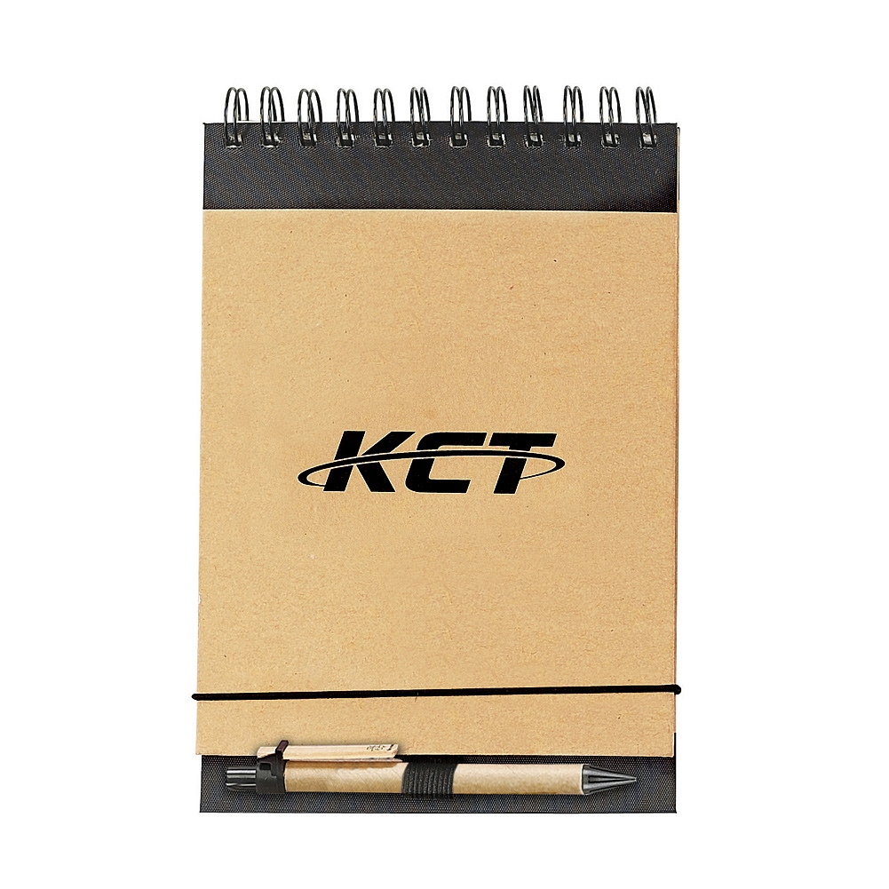 This unique, earth-friendly journal is made using recycled cardboard complete with 100 pages of lined, recycled paper. An elastic band keeps it closed, and an elastic pen loop holds your pen (pen not included). Metal spiral bound rings and the universal recycle symbol proudly debossed on the back cover make this journal a great green pick. 8 1/4" L x 6" H