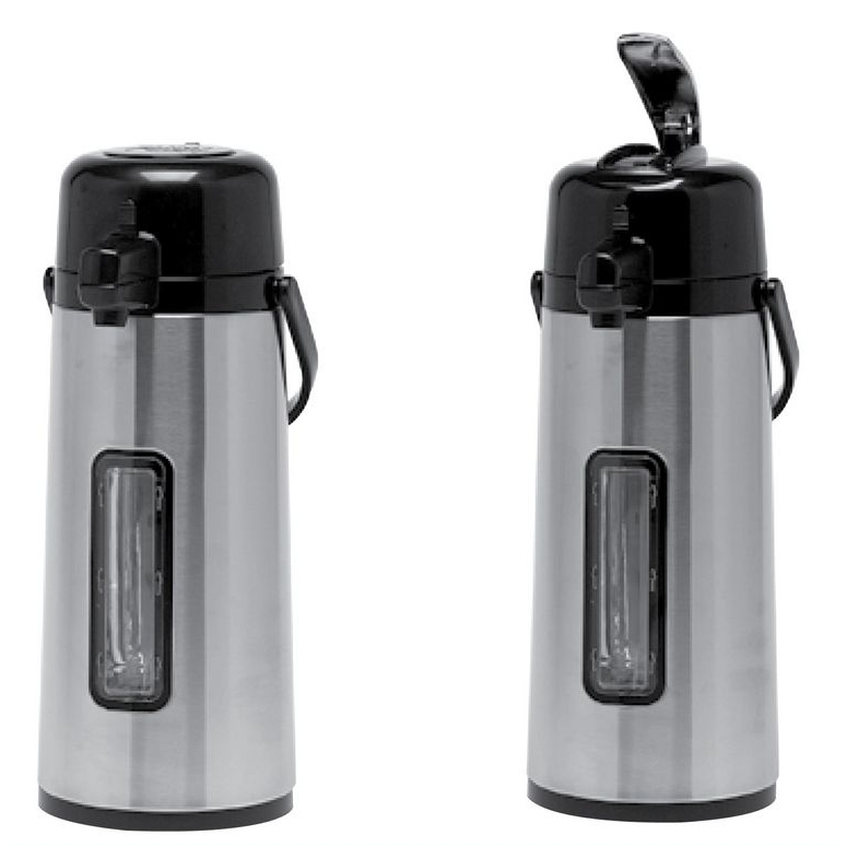 Eco Air Lever 2.2 Liter Sight Glass Thermos with Lever Lid - Stainless exterior and glass interior with vacuum insulation. Exterior sight glass to view content level. Hand wash. 16" L x 6" W x 8" H