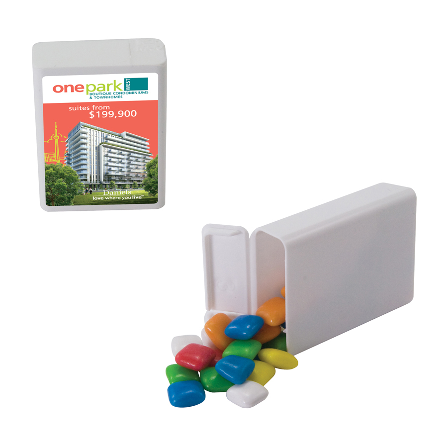 This Plastic Mint Dispenser is refillable and comes filled with Gum. Printed with a 4-color process laminated decal or a 1-color direct imprint. Great for trade shows, sales person leave-behinds, and new product introductions. These plastic dispensers can also be filled with a variety of chewing gum. Please call for other available filling options. Complies with CPSIA, FDA, Food Grade, Prop 65, TSA. 1 5/8" H x 2 1/4" W x 1/2" D