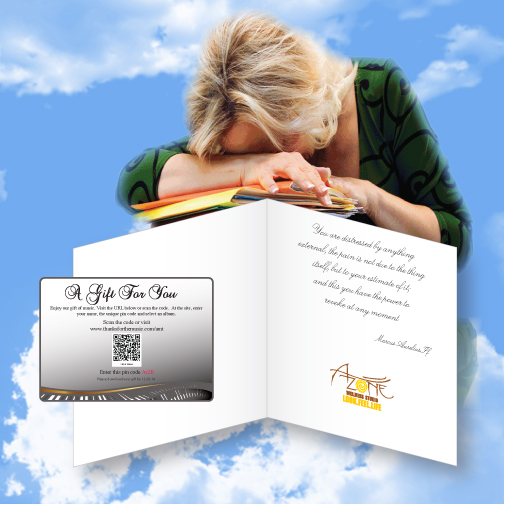Any Acclaim Greeting Card with download certificate printed on inside left panel of the card. Go to url indicated, enter pin code on the landing page and you will see full music album choices (FD10 Revitalize Guided Meditation & Stress Breaks) for downloading. Greeting cards can have 4CP imprint in 3 locations. See Sales Tools for sound bytes of music. Contact Soundline for more information.
