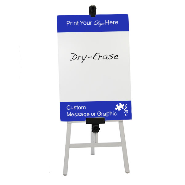 The dry erase board stand is available with a printed header and/or foot to showcase your company name and logo. A sturdy tripod frame is included to make it easy for you to display your write-on board at a trade show, college fair, conference center or special meeting. Purchase includes easel stand, and printed metal poster. 48" W x 36" H