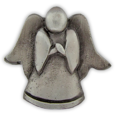Contemporary Design, 3D Angel Praying Lapel Pin. Antique Silver. Includes a clutch back and is individually poly bagged. 3/4" H