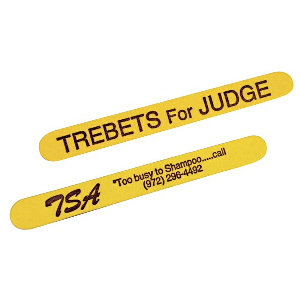 Eye catching yellow emery boards. The front side is Yellow and the back side is garnet colored. We imprint on the yellow side. Standard imprint color is Black. All changes of copy must have a common logo/copy, must be the same item and imprint color, must have 1500 minimum and multiples only. Special Ink Mix: Exact color match cannot be guaranteed especially on colored stock. Other standard ink colors: Red, Green, Burgundy and Rhodamine Red. No blue ink. 4 7/8" L x 1/2" W