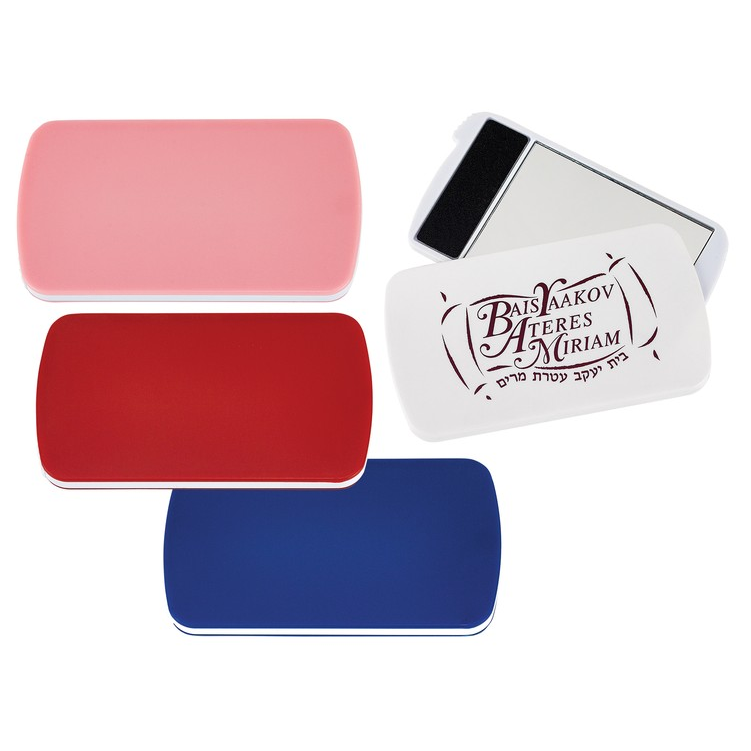 NEW! Pocket mirror with attached emery board - great for those "nail emergencies!" Slides open to reveal the mirror and emery board. Available in pink, red, blue, white or assorted. 3 3/4" L x 2" H