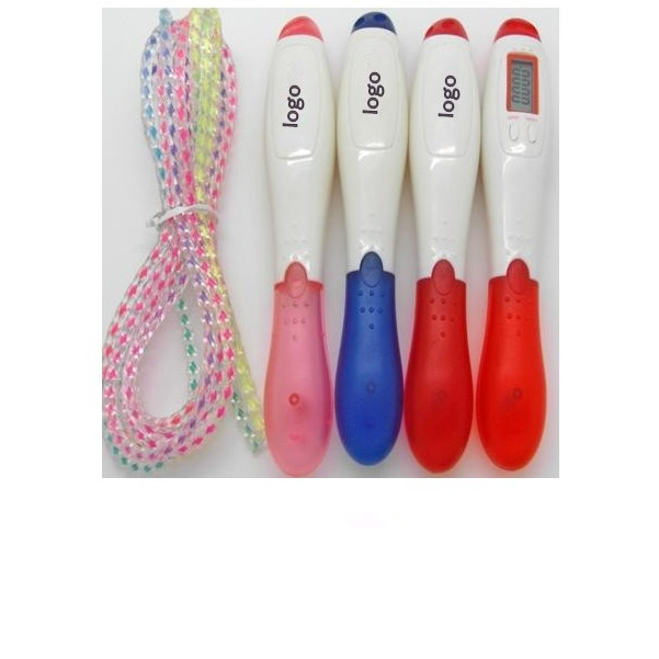 Battery powered electronic jump rope. Includes clock on handle also with count down exercise time, how many calories burned, and jumps completed. A multi-function jump rope that counts rotations and calories burned on the digital screen. Comes unassembled in a vinyl bag. Adjustable rope included. 7' L