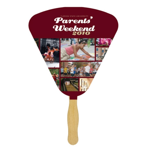 One color imprint fan with wooden handle. Whether you decide to sponsor an event and pass this great product out there or if you just hand them out to passersby on scorching hot days, this hand fan is certain to bring a smile to anyone's face. Seashell fan, glued, 1 sided, 1 color imprint. Complies with CPSIA. 7 1/2" W x 7 3/4" H