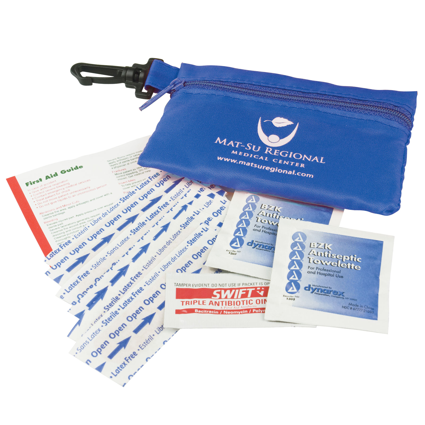 Brightly colored polyester zip bag with hang clip is convenient, compact and excellent for trade show give-aways. Contains 6 latex-free adhesive bandages, 2 antiseptic towelettes, 1 triple antibiotic ointment packet, first aid guide. FDA compliant content. Complies with ANSI, CPSIA, FDA. 3 1/4" H x 4 3/4" W