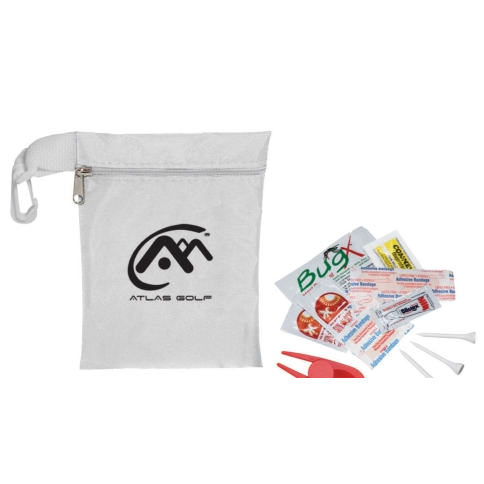 The golfer's pal kit with tournament amenities features a secure zipper closure with web and clip. Amenities include: 3 golf tees, 1 divot fixer with ball marker, 2 mini bandages, 2 3/4" bandage, 2 sunscreen packets, ibuprofen packet, insect repellent wipe and Blistex49838 packet. 5" W x 7" H