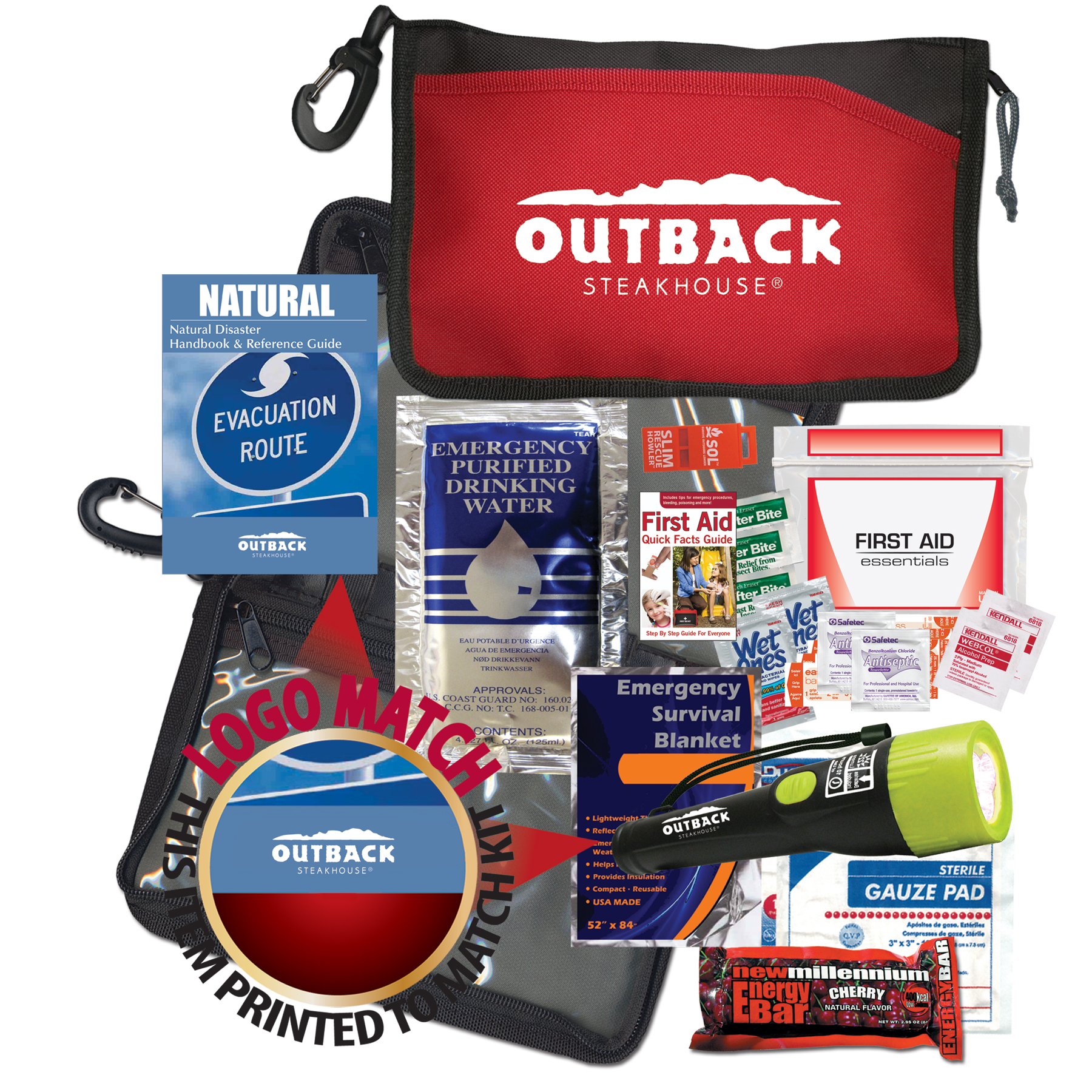 This pack has a variety of personal and emergency items to help you survive in a disastrous situation. It includes: 1 Flashlight with Batteries and Imprint, 1 - 400 Calorie Emergency Survival Bar, 1 Emergency Water USCG Approved, 1 Emergency Blanket, 1 Whistle, 1 - 48pg Natural Disaster Guide with Customer Imprint, 2 3x3 Gauze Pads, 5 Premium Bandages, 2 Alcohol Pads, 2 Antiseptic Swabs, 2 Wet Ones Antibacterial Wipes, 3 Afterbite Itch Erasers, 1 First Aid Quick Card. Complies with OSHA, USCG DOT. 8.5" L x 5.5" H x 2" D