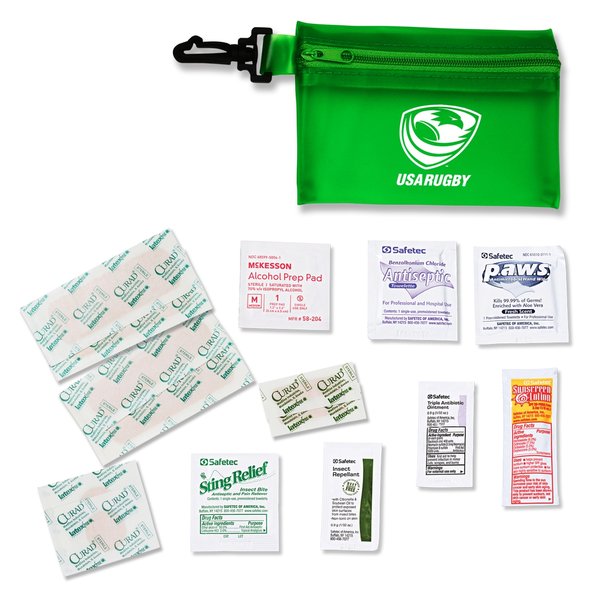 This kit contains all items in Med1 Basic First Aid Kit plus: (1) SPF 30 sunscreen towelette, (1) wash-up towelette, (1) insect repellent (30% Deet) and (1) insect sting relief pad. Complies with Prop 65. 4 3/4" W x 3 1/4" H