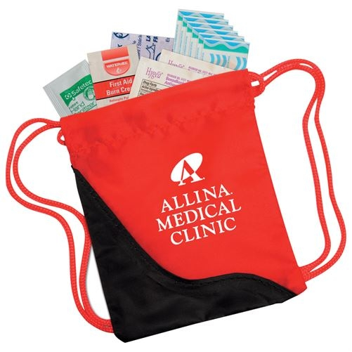 Kits prepare recipients to safely enjoy the outdoors and for any unexpected emergency. Easy-carry, easy-access Mini Sling Bag with drawstring closure. First Aid Kit includes 6 latex-free bandages, 2" x 3" adhesive pad, first aid cream packet, 2 antiseptic towelettes, and hand sanitizer packet. 4" W x 4 1/2" H x 1/2" D