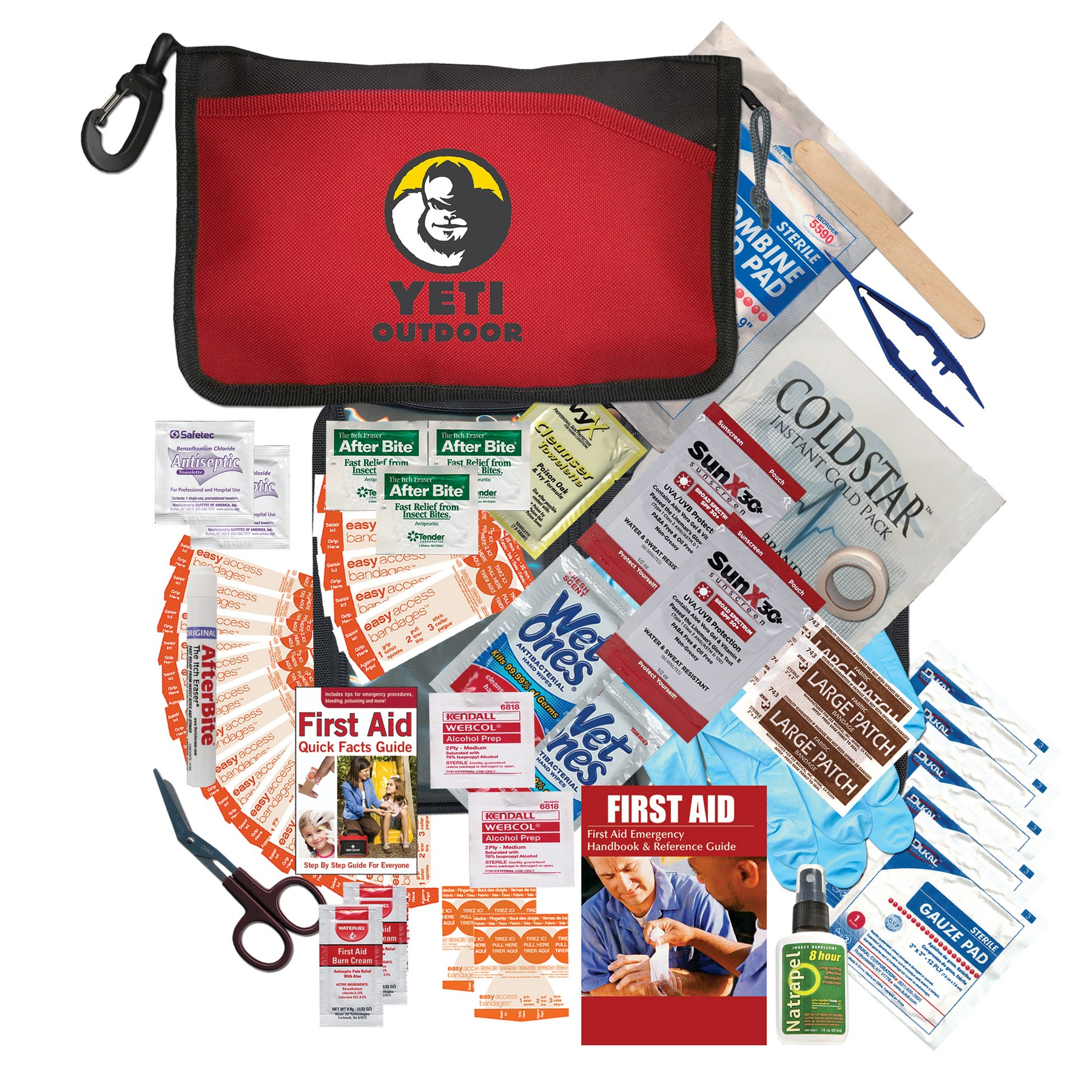 We've packed this kit with all the quality items you'll need for your next outdoor adventure. Excellent for camping, hiking or any outdoor event or family emergency. Oversized hook included. Includes: 2 Premium Sunscreen Packets, 1 Tweezer, 1 Poison Ivy Medication Pkt, 1 Natrapel Insect Repellent Spray, 1 Ice Pack, 1 - 48pg Emergency First Aid Guide, 5 - 3x3 Sterile Gauze Pads, 1 Pair Nitrile Gloves, 1 Scissor, 1 ABD Super Absorbent Gauze Pad, 1 Finger Splint, and more!. 8.5" L x 5.5" H x 1.5" D