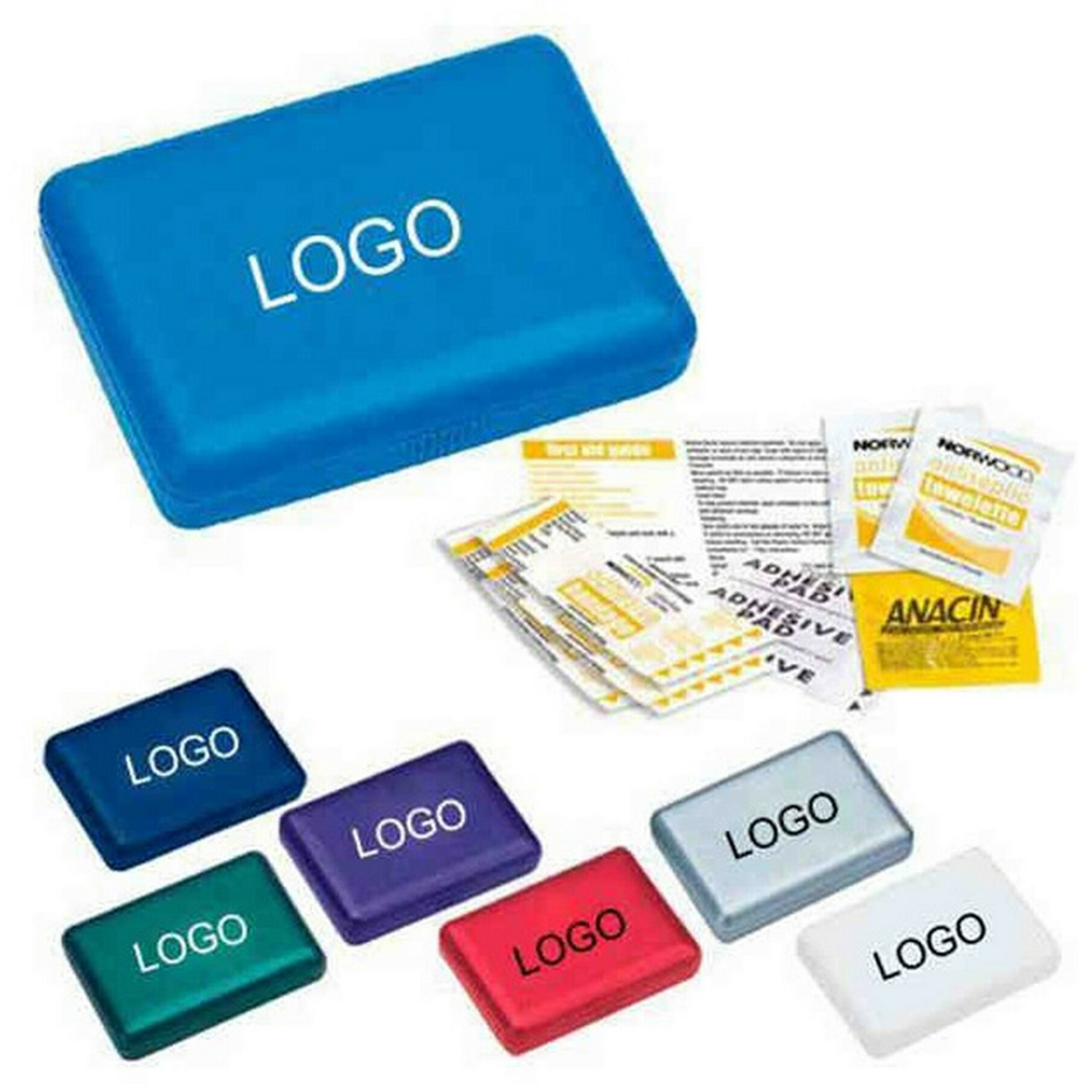 Compact First Aid Kit should be stocked in every branch of your corporation, every classroom in your school, and in your own car, purse, briefcase, and office. Slim and trim, this compact kit contains an assortment of first aid components including 4 bandages,2 snips,1 adhesive pad,2 antiseptic towelettes, 1 Anacin packet,and 1 first aid guide. 4 3/4" W x 3 1/4"" H x 1 1/4" D