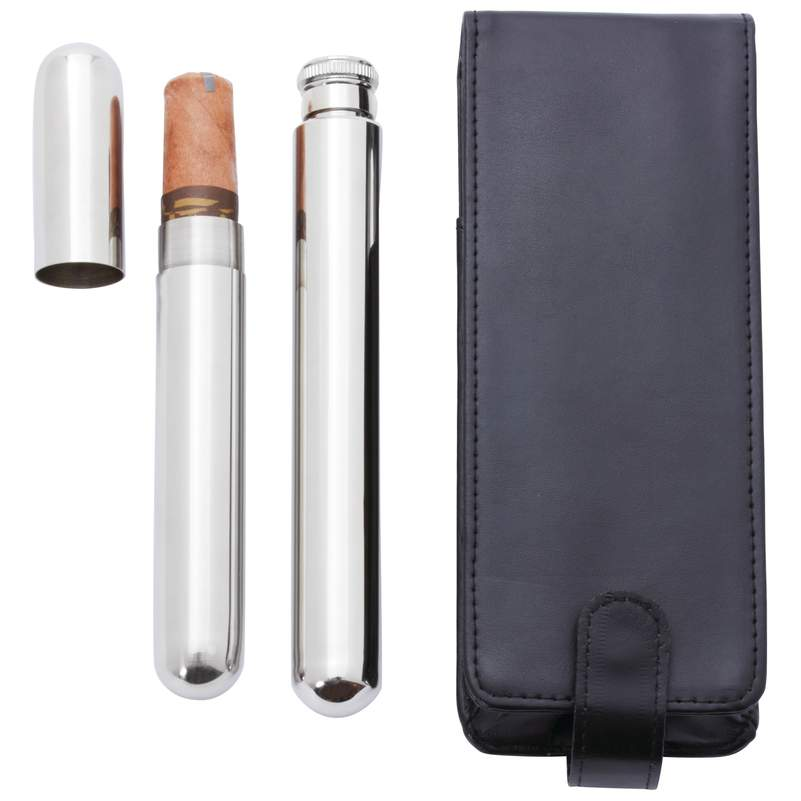 2oz Stainless Steel Flask with Cigar Holder. Features 2oz flask and cigar holder; mirror finish; and black carrying pouch with snap closure. Pouch measures 2-3/4" x 5-1/2" x 1-1/8". Limited lifetime warranty. White box.