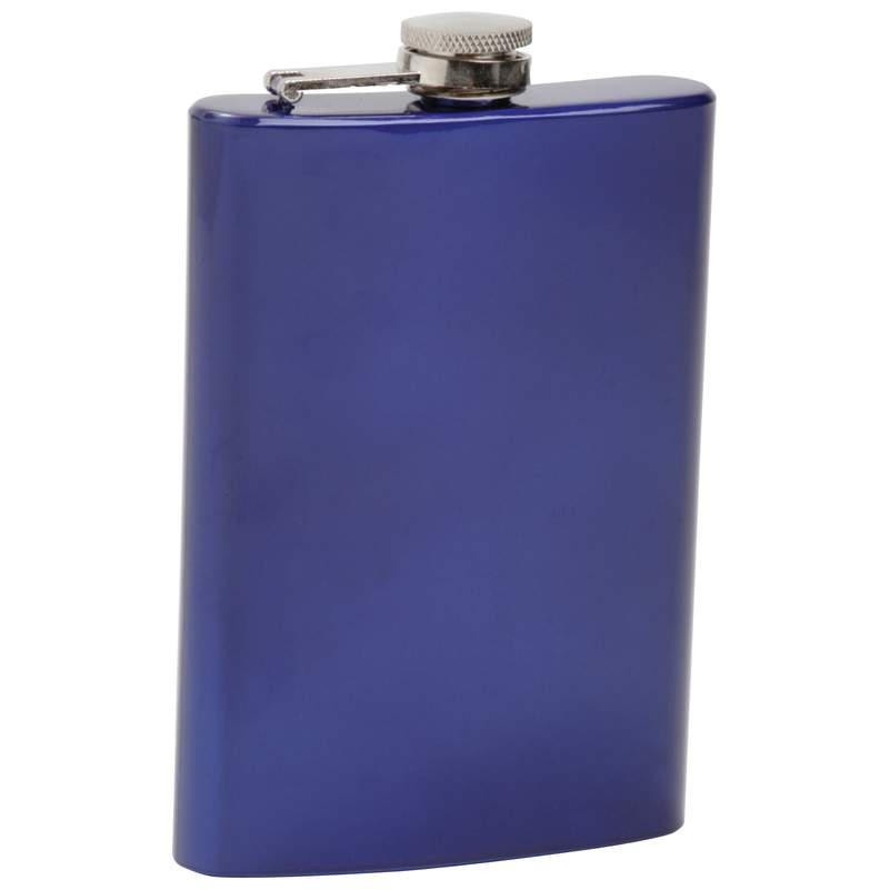 8 Oz. Stainless Steel Flask w/Blue Finish. Stainless steel flasks provide sleek, sturdy containment and transportation for your spirit of choice. Features screw-down cap and metallic painted finish. Measures 3-5/8" x 5-3/4" x 7/8". Limited lifetime warranty. White box.