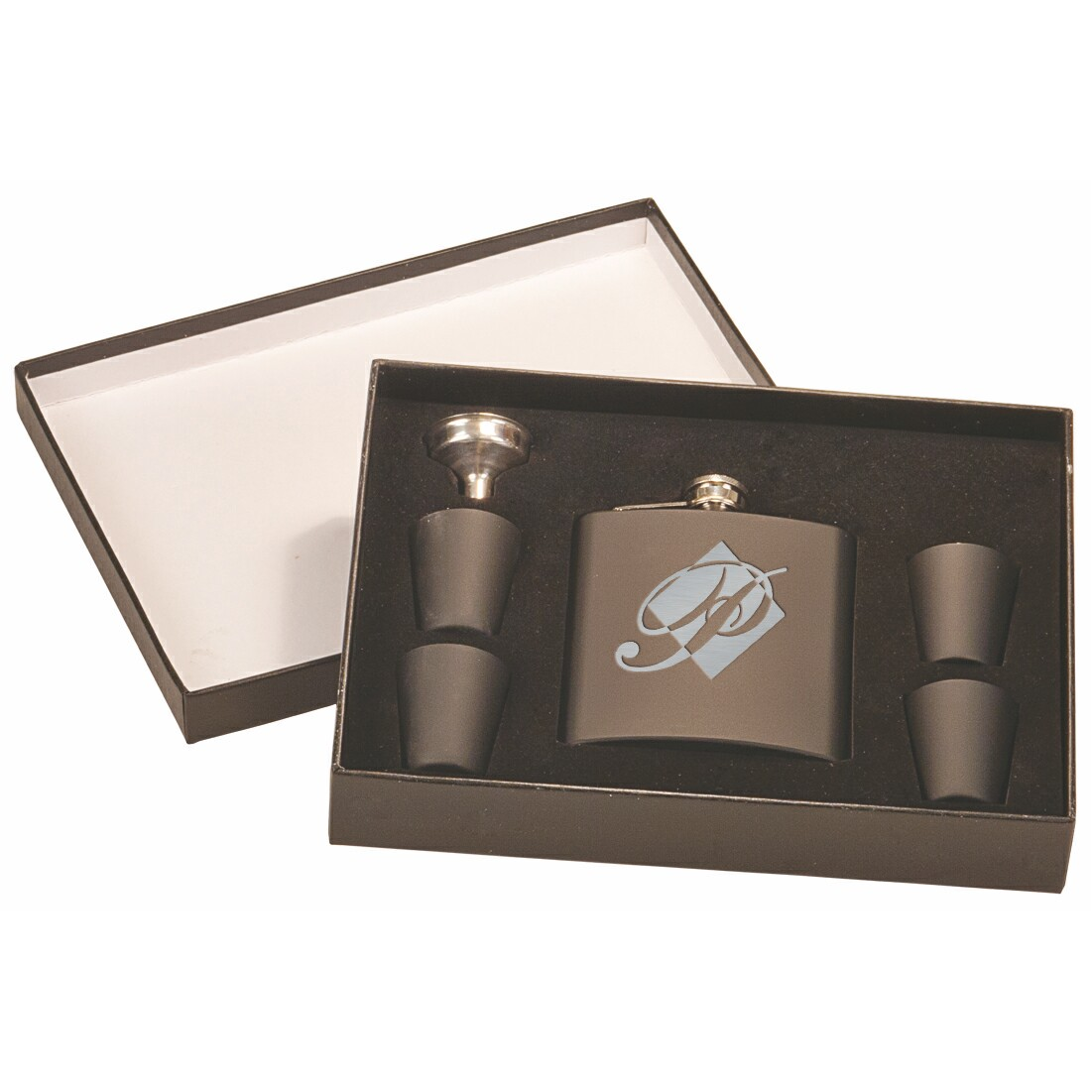 6 Oz. Matte Black Stainless Steel Flask kit in presentation gift box. Personalized! With your Logo or message included on a silver plate-front & center! Includes Flask, Funnel and 4 Shot Glasses. (Alcohol not included.) Great for corporate and executive gifts, incentives and promotions, wineries, vineyards, wine and liquor stores and restaurants. 8" L x 6" W x 2" D