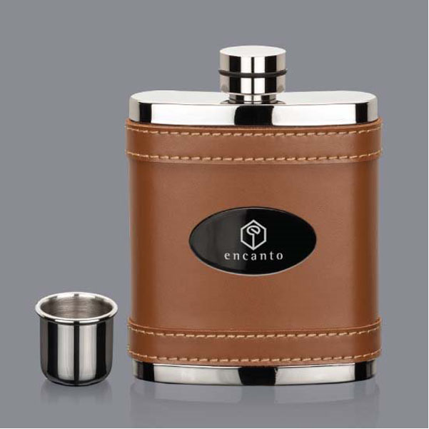 A smooth Napa leatherette case covers our silver metal, 7oz slim hip flask with screw top lid and shot glass cover. Imprint is featured in monogram-style black nickel oval window. 7" W