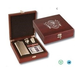 Beautifully appointed set includes flask, funnel, shot glass, deck of cards and 5 dice. Laser/Color Filled: Up to 8 square inches included in our price. 2 3/8" H x 8 1/4" W x 8 1/4" D