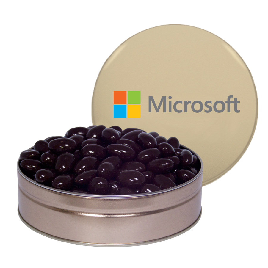 This Gold Grand Tin offers chocolate almonds and comes printed with a 1-color direct imprint on the lid (solid-color tins), or a greeting card (designer tins). You can also add a 4-color process laminated decal to the lid of any of our solid-color tins. Great food gift idea for the holiday or Christmas. 1 13/16" H x 6 11/16" D