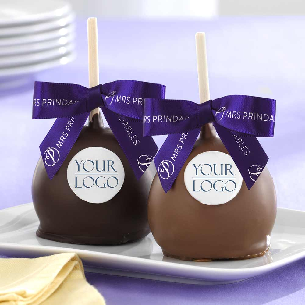 Enjoy two Petite gourmet caramel apples in our signature gift box. This set comes with one milk chocolate and one dark chocolate Petite apple each with a custom 4-color edible sugar logo. 9" L x 5" W x 4" H