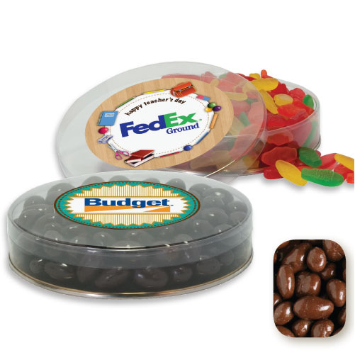 Delicious treats on an acetate Candy Platter! This acetate candy platter can be filled with your choice of candy and confections. Price includes 16 Oz. of Milk Chocolate Raisins. 1 color direct imprint or 1-4 color process imprint on label. Complies with CFIA, FDA. 6" W x 1.5" H
