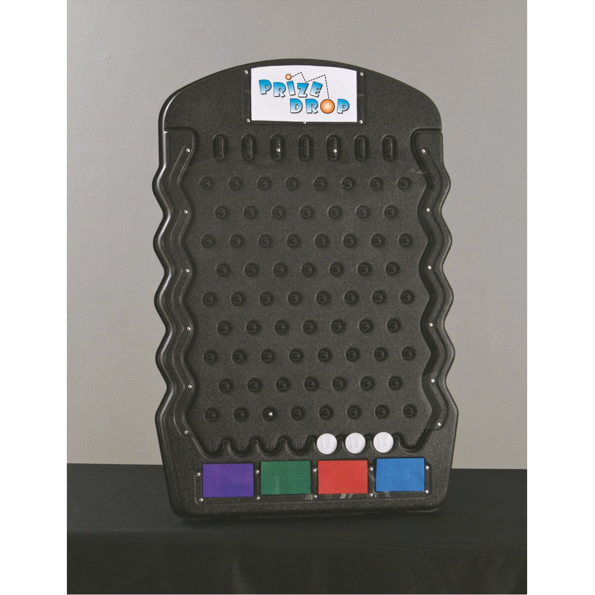 Drop the puck and watch it bounce down and slide into the prize slot. No assembly required. 25"x36"x22", 6.5 lbs. Black Mini Prize Drop game includes 3 White Mini Prize Drop Pucks. Additional pucks available for purchase. Customizable - Choose and print your own prizes and add your company logo to the title insert. Insert templates provided online in Microsoft Word and Adobe Illustrator formats. Prizes can be printed on standard 8 1/2"x11" paper. 25" W x 36" H x 22" D