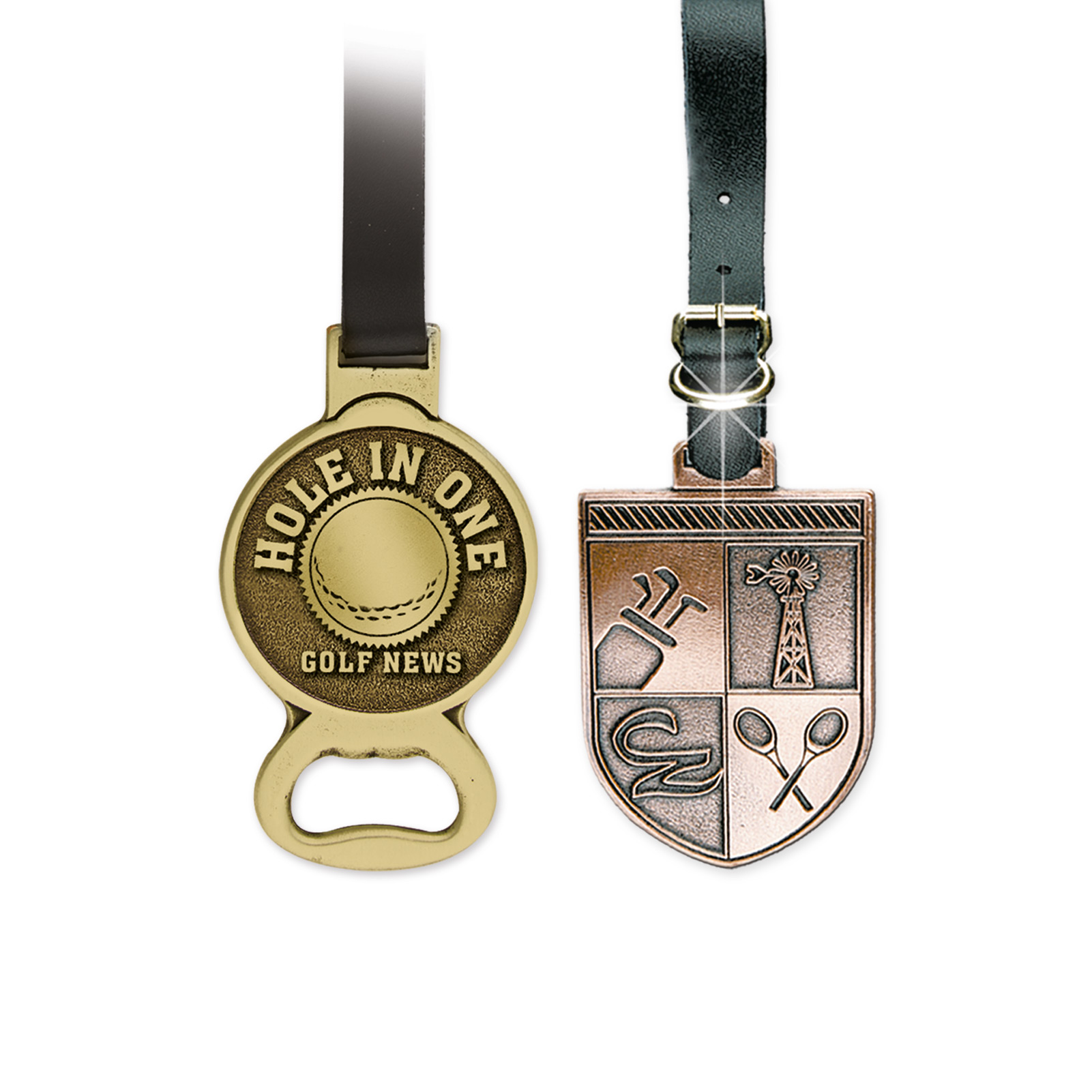 Custom shaped golf tag on an 8" leather strap. 3" L x 2" W