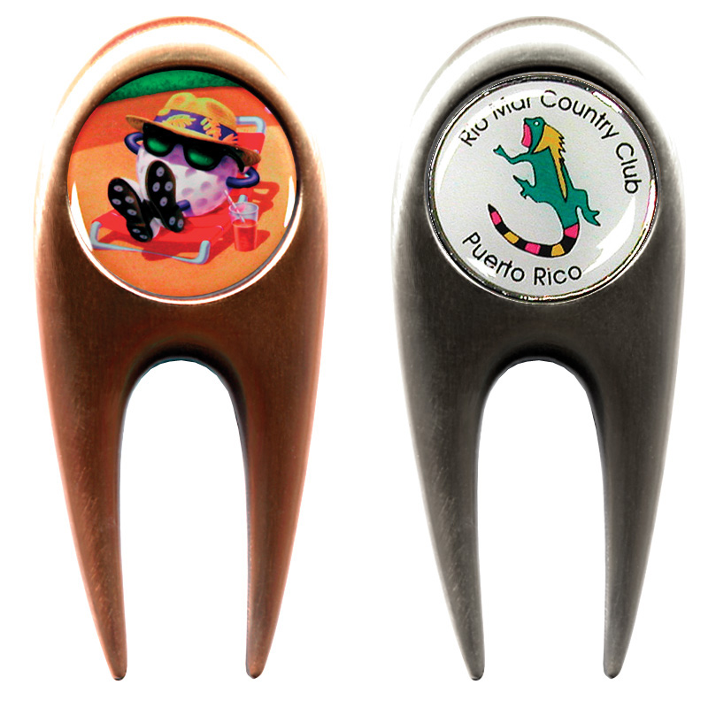 Divot repair tool with a 1" magnetic custom ball marker that is laser printed 4-color process on vinyl, with an epoxy dome over the top. PMS match as close as possible is no charge, but may not be exact as this is cmyk printing. Please specify finish (Gold, Nickel or Copper) when ordering. This item is also available with a Die Struck ball marker, but the lead-time is longer, inquire for details.