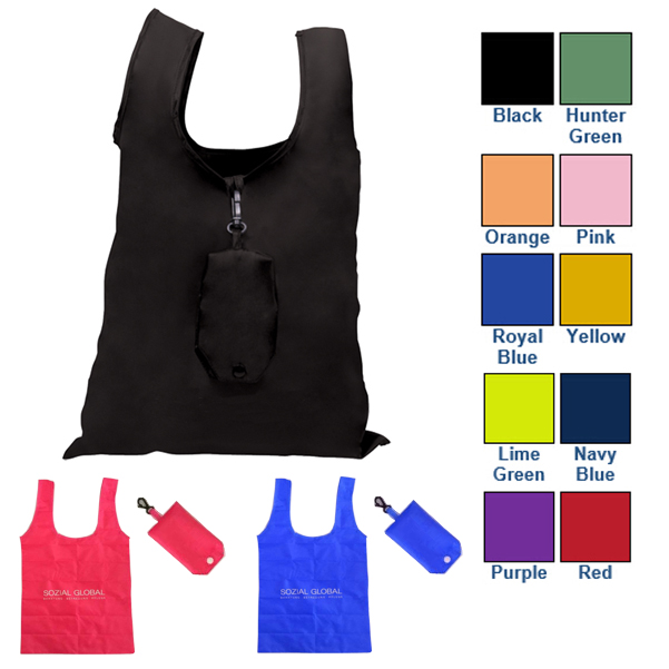 Reusable 210T high quality Polyester tote folds into pouch for storage in bags, glove compartments and pockets for shopping on the go. Pouch features black snap closure and black mini plastic snap hook on loop. Custom bag color and PMS printing is available. 15" L x 18" W