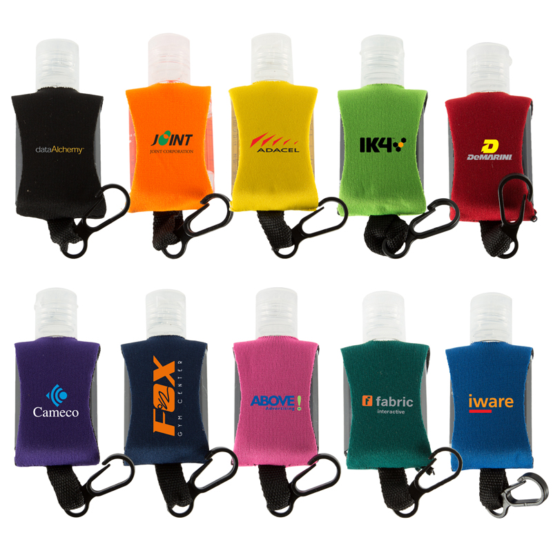 An odorless FDA approved hand sanitizer gel in a neoprene sleeve with a plastic Jhook. 2 3/4" W