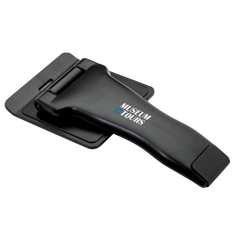 This tablet stand doubles as a handle grip. Position the grip vertically, horizontally or anywhere in between for maximum comfort during hand-held or table-top usage. A non-permanent adhesive provides a strong grip to your device, yet is easy to remove an. 2 3/4" W x 6" H x 3/4" D