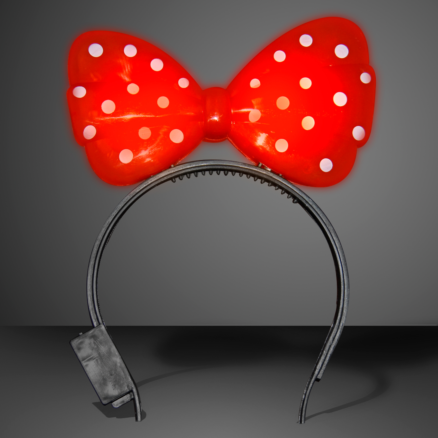 So cute and so fun, check out the Red Light Up Big Bow Headbands! The bow is a blue plastic with white dots. The headbands look great worn all year long, outdoors, inside, at a party or amusement park! To activate your Red Light Up Big Bow Headband, slide the switch above the battery pack to the ON position. Once on they will light up a pretty red. Red Bow Headbands do not flash, they only have a still light function. These light up headbands are one size fits most. Complies with ASTM, CPSIA, Prop 65. 8.5" W x 6.25" H