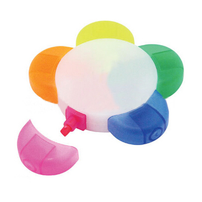 This flower multi color highlighter is an attractive flower shape that has a white body with 5 colored nibs. Marker ink matches color of cap. Absolutely an ideal product that makes you special and fashionable. 3" Thick