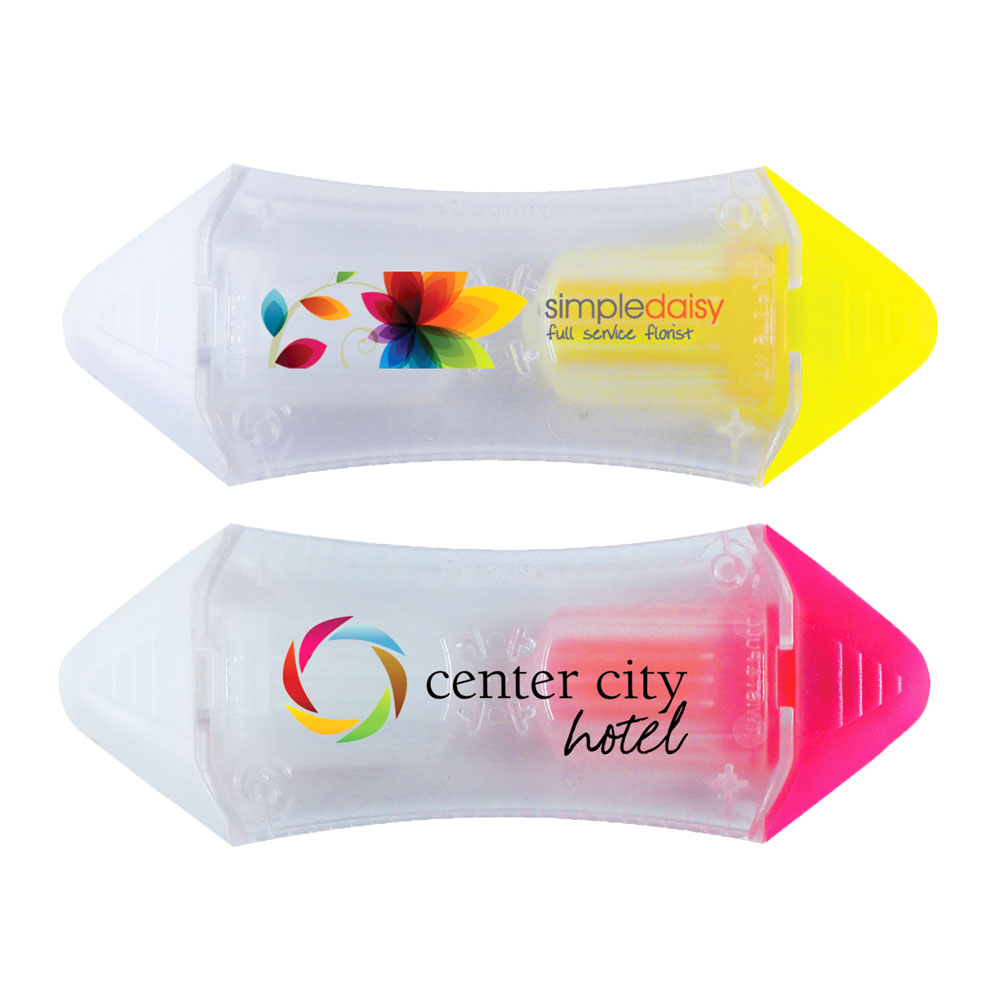 Erases highlighted areas instantly. Clear solution erases highlights from most papers and works only with highlighter, in these products. Assorted colors per order: Minimum of 50 per color. Imprint color must stay the same on all. 4 1/4" W x 1 5/8" L x 3/4" H