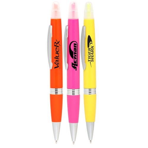 Pen writes in black ink; highlighter matches barrel color. 5.75" L x 0.65" W