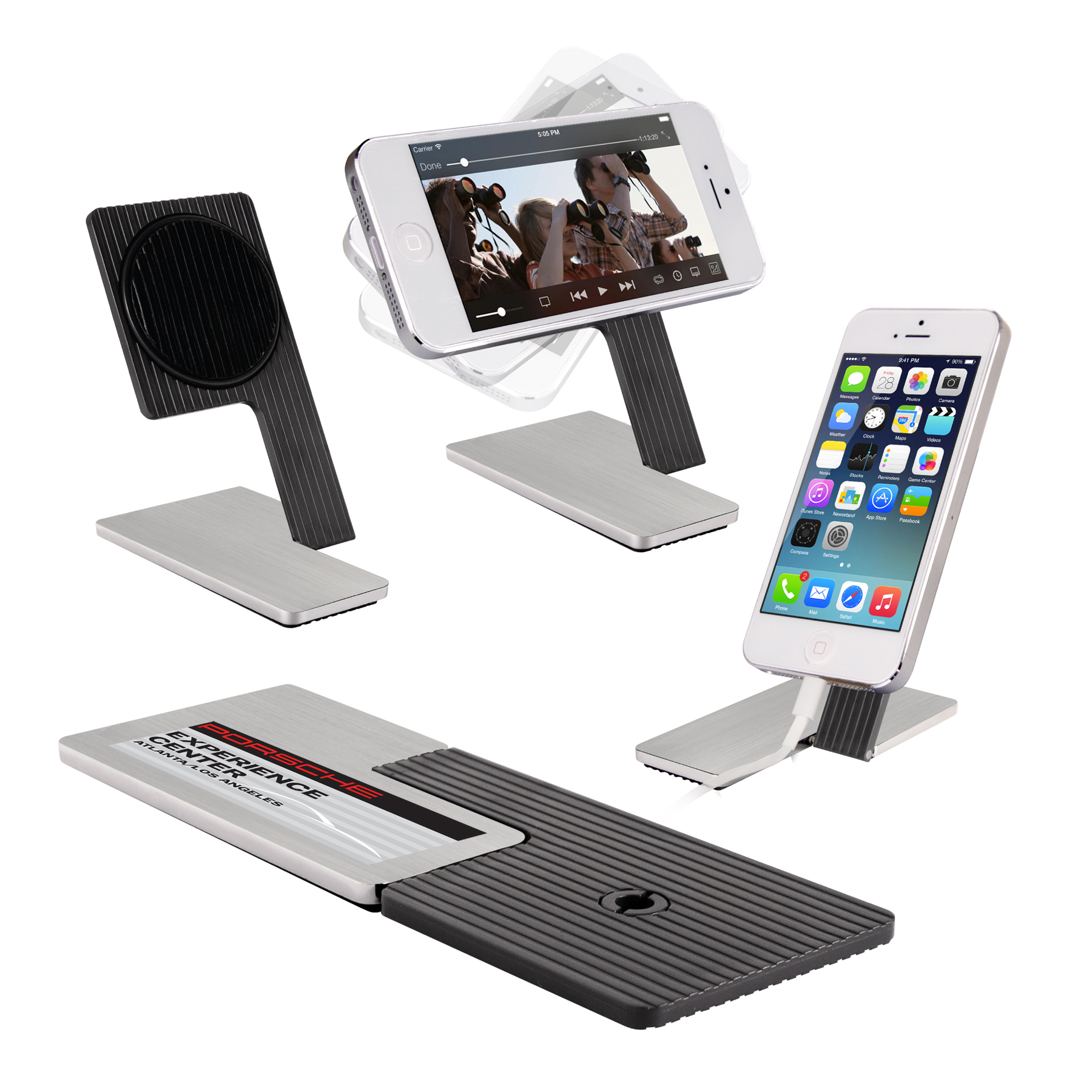 Metal multi-angle cell phone holder, heavy zinc alloy brushed metal base, 360 degree free turning table with super strong sticky gel pad, fits all kinds of phone. It is capable to hold cell phones in all different sizes and also great for mini i-pad and 7" tablet. 2 1/8" W x 6" L