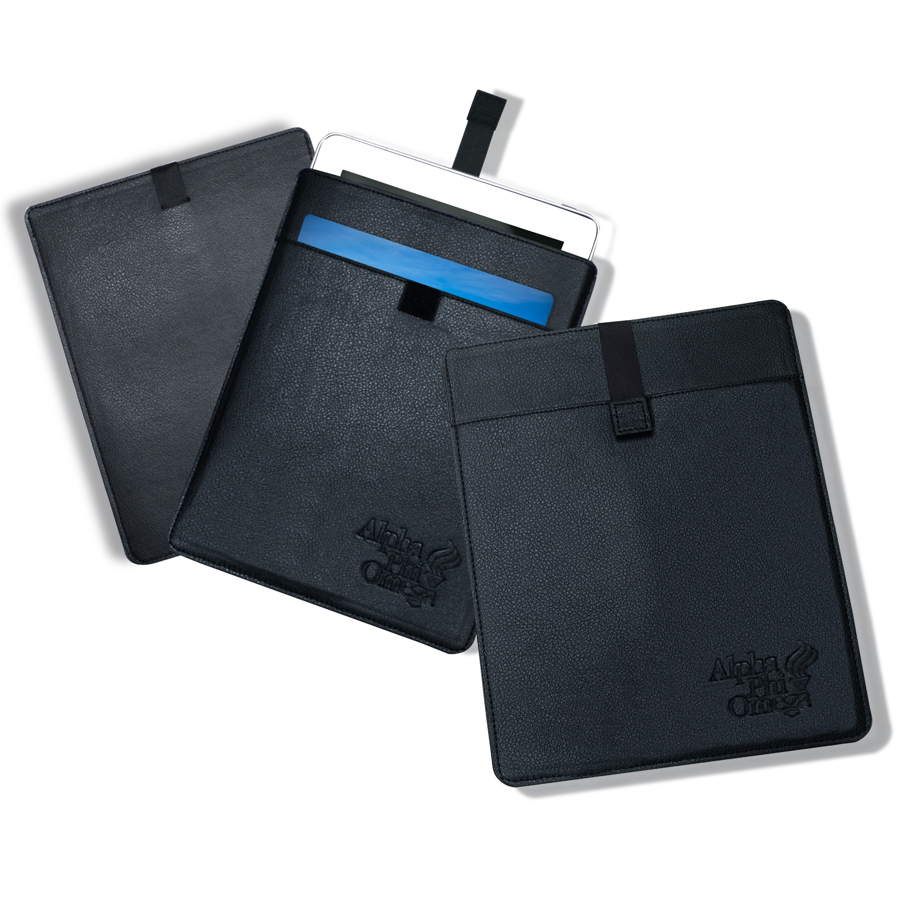 Simple yet practical textured leatherette universal sleeve for 7"-8" tablet or Ipad Mini, Kindle, Samsung Tab. With soft suede interior to protect screen plus pull tab design, removing device is easy and convenient. Features front pocket for storage of notes and accessories. Velcro closure at the end of pull tab holds the tablet securely. Also available in larger size to fit 10" tablet. 6 3/16" W x 8 1/2" H