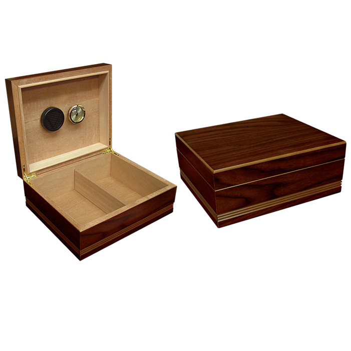 The Duke: Features a rich walnut finish and handsome routed design make it a great choice for the beginner or experienced cigar connoisseur. This 25 - 50 count humidor is designed to maintain the perfect 68% - 75% humidity. The interior has a removable humidifier that can be filled with distilled water so you can be sure your cigars are kept in exactly the right environment. Includes a hygrometer and humidifier. 10 1/4" W x 4 1/4" H x 8 3/4" D