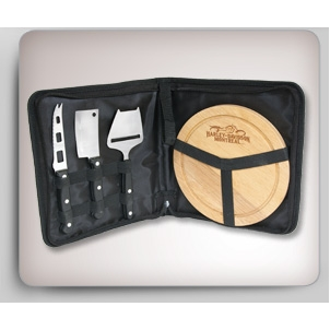 Portable cheese serving set in zippered nylon carry case. Holds 8" round wooden cheese board and 3 cheese knives (slicer, cleaver & universal cheese knife for semi-soft cheeses) held by elastic straps. 8 5/8" W x 9 3/4" H x 1 1/2" D