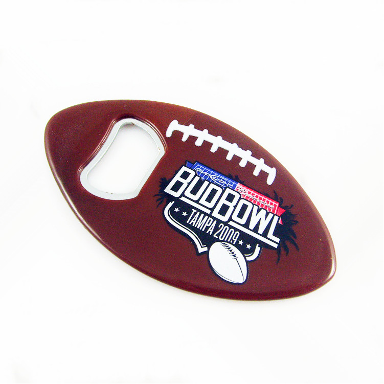 Football shape bottle opener with magnet. Big imprint area for logo. Strong refrigerator magnet. Solid metal construction for the opener. Every household loves it! Ideal for beverage, bottle, transportation and motor coach. 4 1/4" L x 2 1/2" W