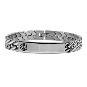 Made of 316L stainless steel, this medical ID bracelet is solid and sturdy. The clasp is easy to use yet holds strong. Please note that the style does not allow too much flexibility - it fits more like a bangle.