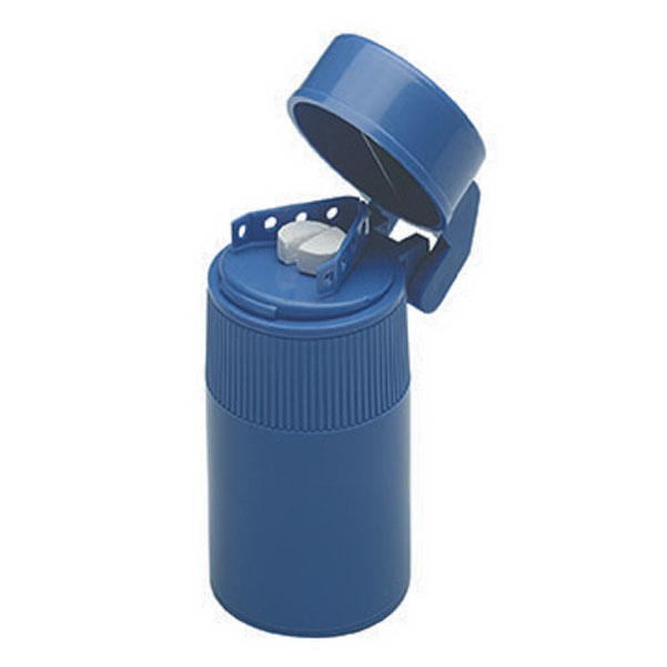 Serrated crushing surface. Stainless steel blade. 4 compartments for storage. Drinking cup included. Complies with ISO 9001. 3 1/2" L x 1 1/2" Diameter
