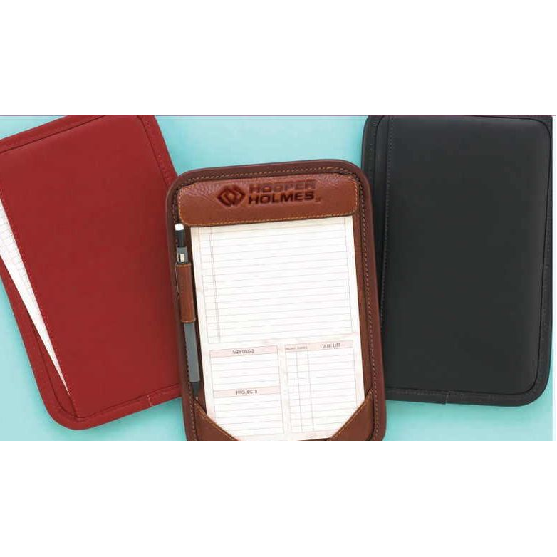 Made from hand worked European leathers. This new concept in note taking is as handy as it is innovative. Perfect for crowded meetings, "walk around management" or taking notes in a vehicle. This a great gift for all walks of life. Holds a 5" x 8" task/note tablet, has a leather lined pocket on back, and a pen loop. Product is poly bagged. 6 1/2" W x 9 1/2" H