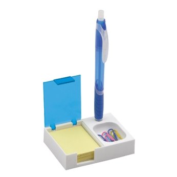 60 sheets of yellow sticky notepad. Pen holder and clip holder. 3 3/8" W x 2 1/2" L x 1" H