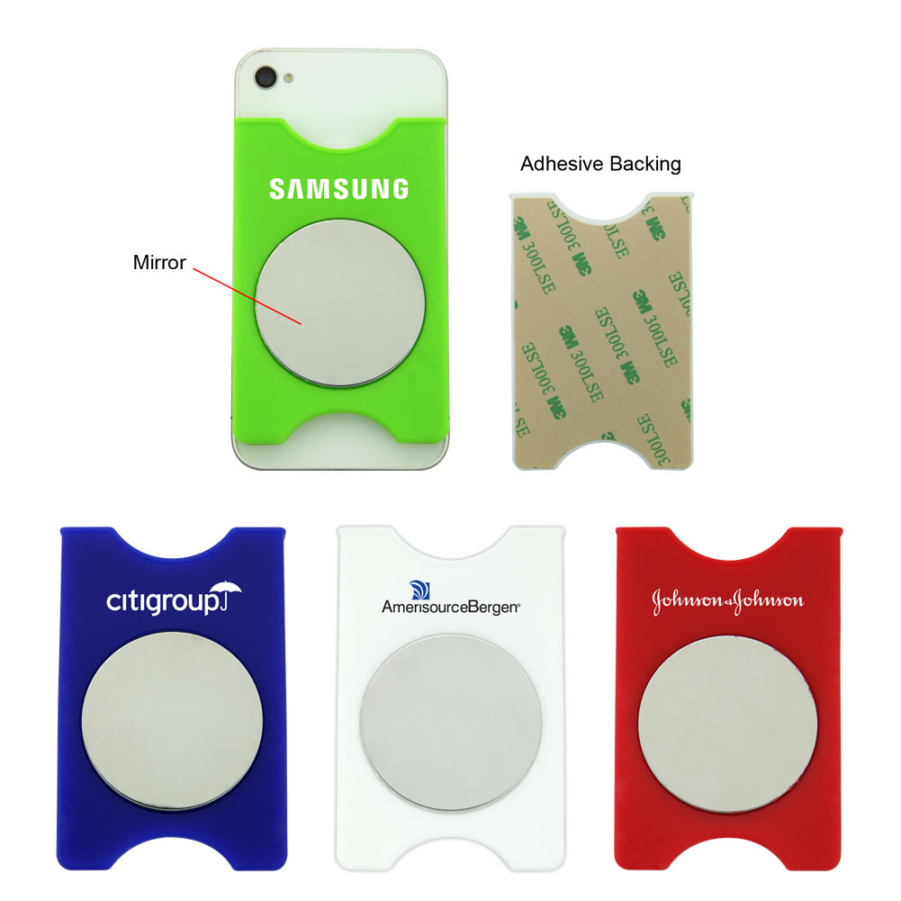 Show off your company logo on every smartphone! Holding 2-3 credit and/or ID cards, this handy giveaway is made of soft silicone. Small round mirror provides convenient reflection. Just the Smartphone Mirror Wallet to the back of your smart phone, tablet or anything you'd like to make a mini wallet. Available in multiple colors and ideal for any event. Have your logo or message imprinted on yours to capitalize on all the exposure. Order today!(((( Patent Pending???))). 2 1/4" W x 3 1/2" H