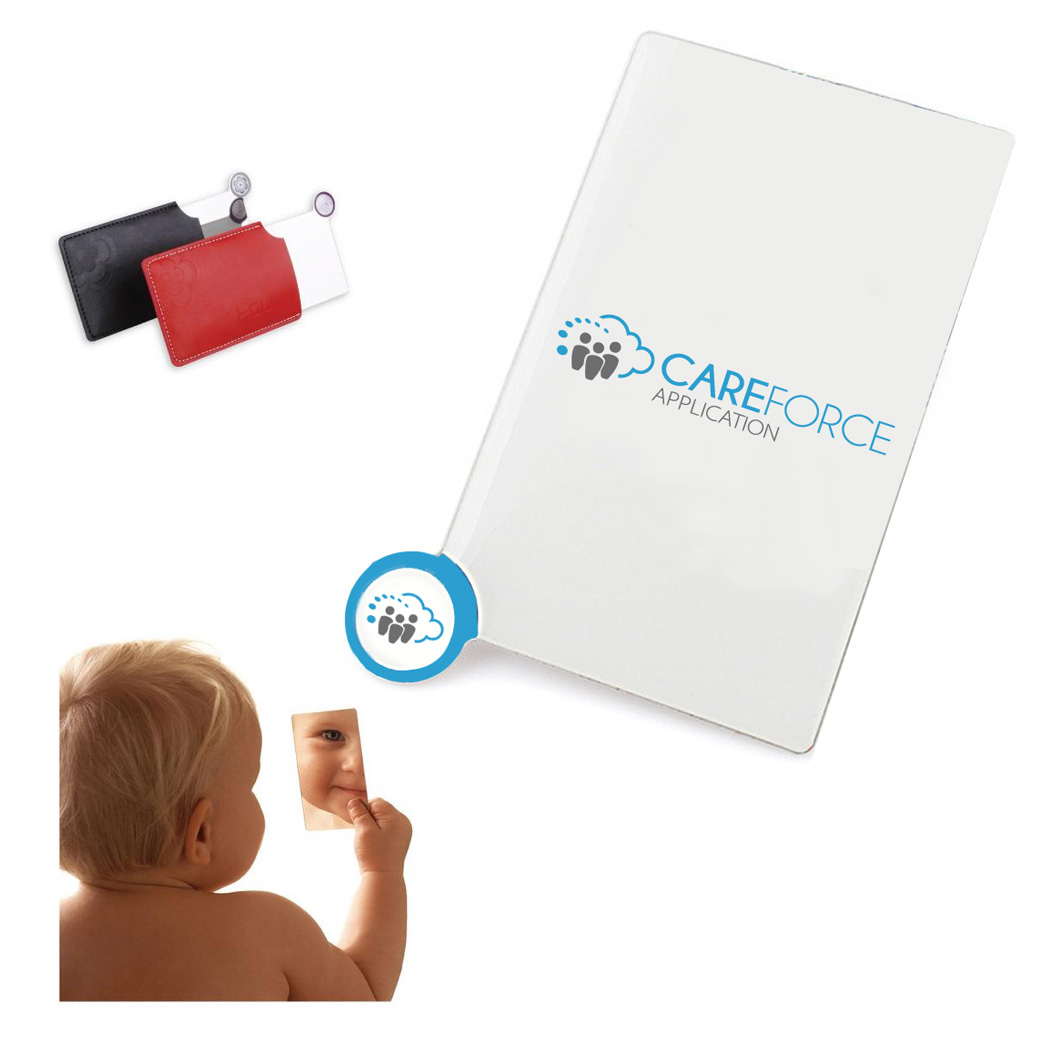 Stainless steel personal mirror. Highly durable reflective material does not crack or break as easily as a standard mirror. Leatherette carrying case keeps your mirror scratch free. 3.50" W x 2.5" H