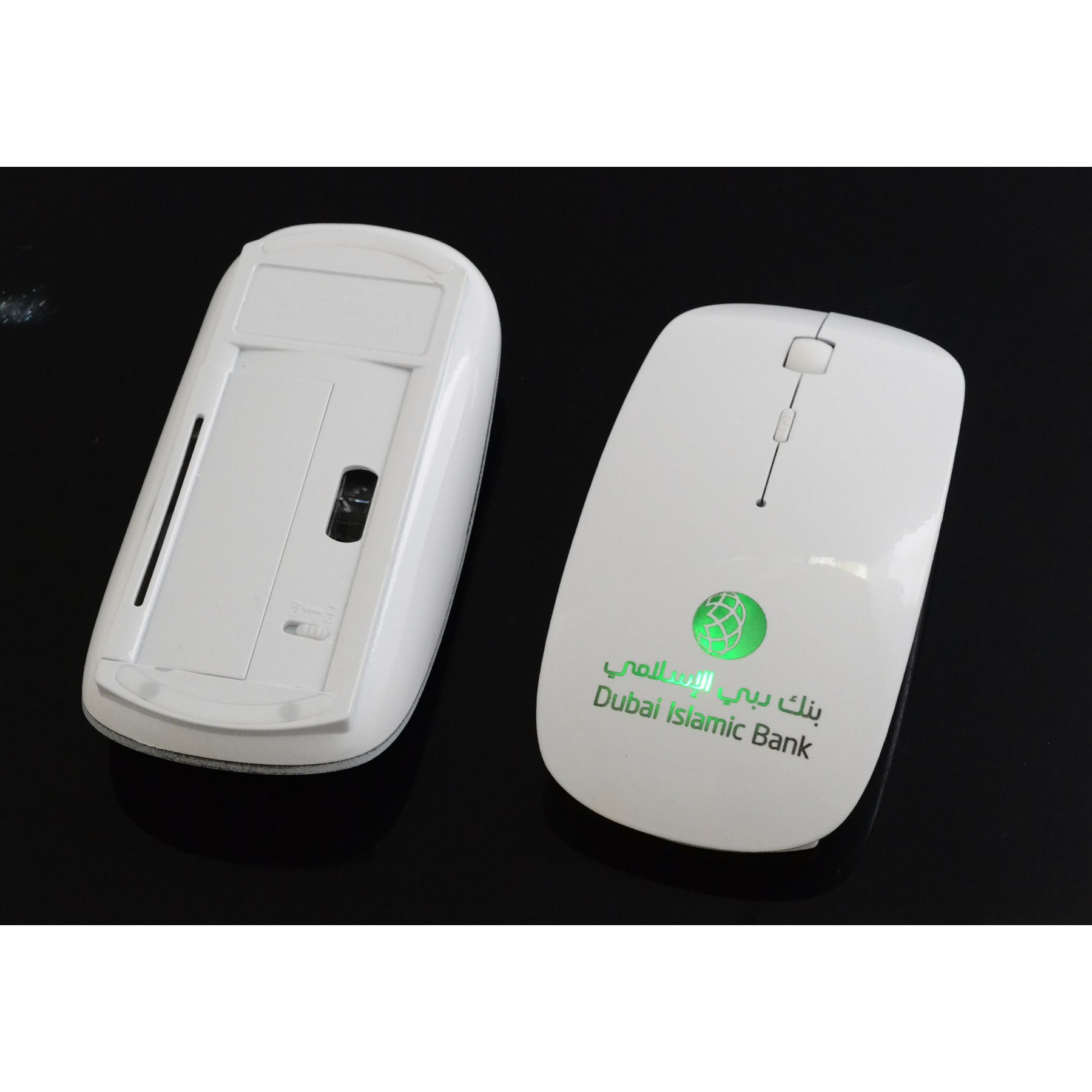 This Ultra slim flat 2.4G wireless mouse with LED light up logo for Apple Mac or windows laptop desktop computers, 1000DPI and up to 10m effective distance, pocket size and light-weight, making it travel friendly and especially useful for business trips and school use. Complies with CE, RoHS. 4.4" L x 2.3" W x 0.9" H