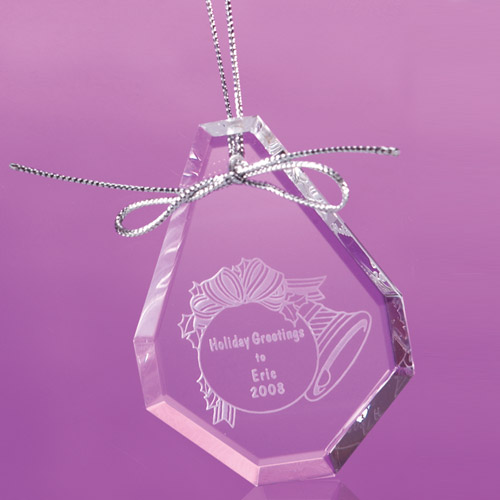 A clear, teardrop-shaped glass ornament with faceted edges. 2 1/8" W x 3" H x 1/4" D