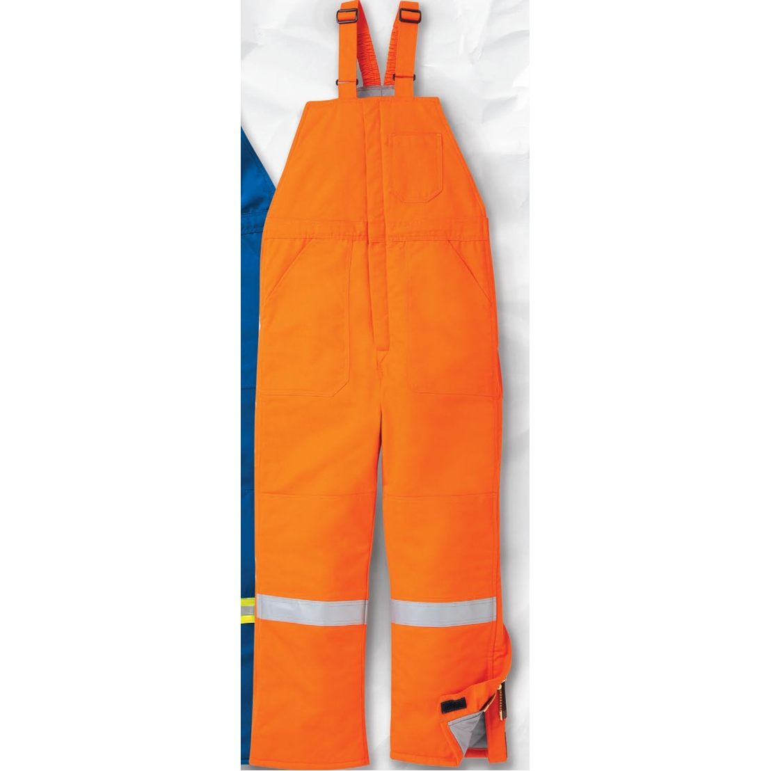 Reinforced double knees. Full, Nomex49838 taped, ankle-to-hip brass zippers with concealed snap closure. Elasticized shoulder straps with non-conductive adjustable hardware. Flame-resistant fabric. Shell: 7 Oz. 88% cotton/ 12% nylon. Water repellent. Lining: 100% cotton. Insulation: 100% Modacrylic. Protection: Arc rating ATPV 44 calories/cm 2. Stocked in Canada only. Complies with ATPV.